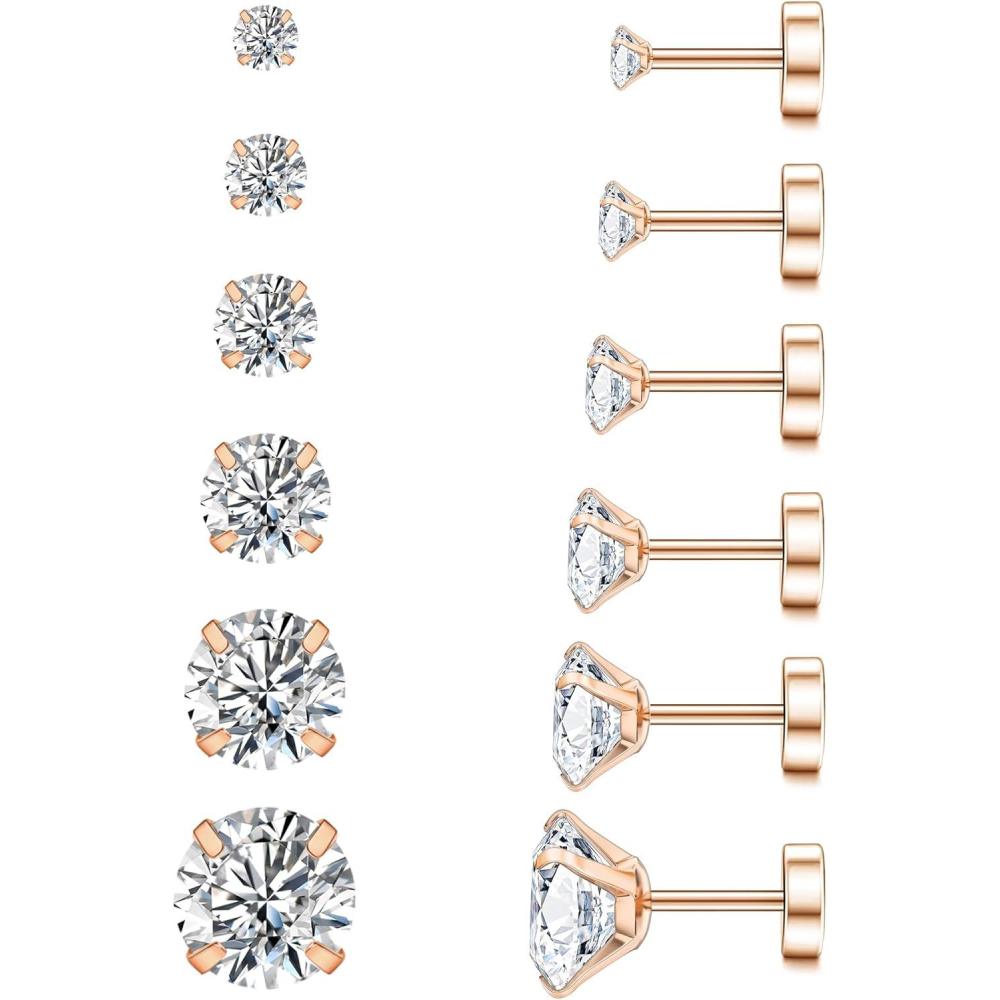 WSSXC 20G Hypoallergenic Flat Back Earrings for Women Men Silver 14K Gold Stainless Steel Stud Earrings Brithstone Cubic Zirconia Studs Surgical Steel Cartilage Earrings for Sensitive Ears(A-003-Rose Gold)